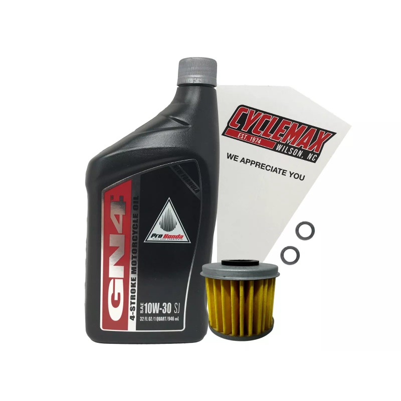 - CYCLEMAX OIL CHANGE KIT INCLUDES: One Honda 08C35-A131M02 GN4 10W30 Quart of Oil, One Honda 15412-MEN-671 Oil Filter, Two 8mm Drain Plug Crush Washers and a Convenient Disposable Funnel.