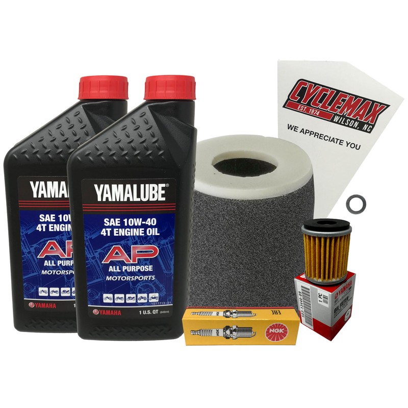 - CYCLEMAX KIT INCLUDES: Two Yamaha LUB-10w40-AP-12 Yamalube 10W40 Quarts of Oil, One Yamaha 5D3-13440-09-00 Oil Filter, One Yamaha 5TG-14451-01-00 Air Filter, One CR8E NGK Spark Plug, One 12mm Drain Plug Crush Washer and a Convenient Disposable Funnel.