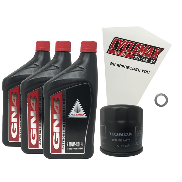 • CYCLEMAX OIL CHANGE KIT INCLUDES: Three Honda 08C35-A141M01 GN4 10W40 Quarts of Oil, One Honda 15410-MFJ-D02 Oil Filter, One 12mm Drain Plug Crush Washer and a Convenient Disposable Funnel.