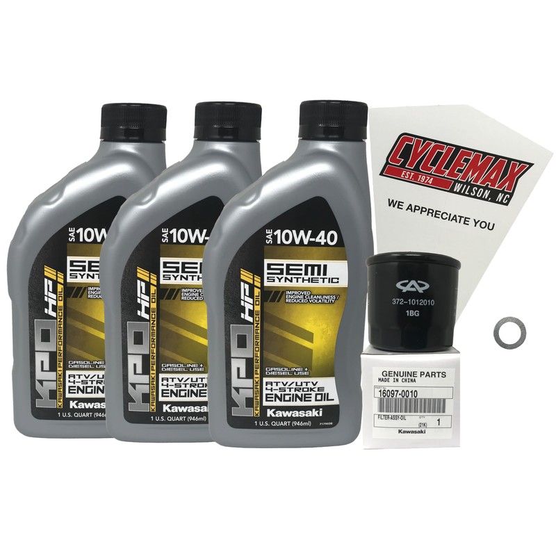 - CYCLEMAX OIL CHANGE KIT INCLUDES: Three Kawasaki PO SS ATV/UTV 10W40 Quarts Of Oil, One 16097-0010 Kawasaki Oil Filter, One 12mm Drain Plug Crush Washer, and a Convenient Disposable Funnel.