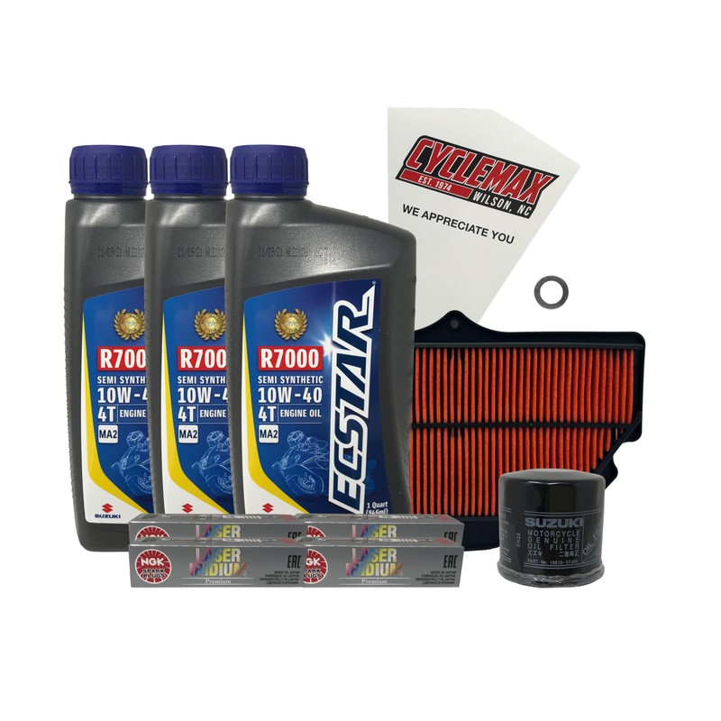 - CYCLEMAX OIL CHANGE KIT INCLUDES: Three Suzuki 990A0-01E30-01Q ECSTAR R7000 10W40 Quarts of Oil, One Suzuki 16510-07J00 Oil Filter, One Suzuki 13780-01H00 Air Filter, Four CR9EIA-9 NGK Spark Plugs, One 14mm Drain Plug Crush Washer and a Convenient Disposable Funnel.