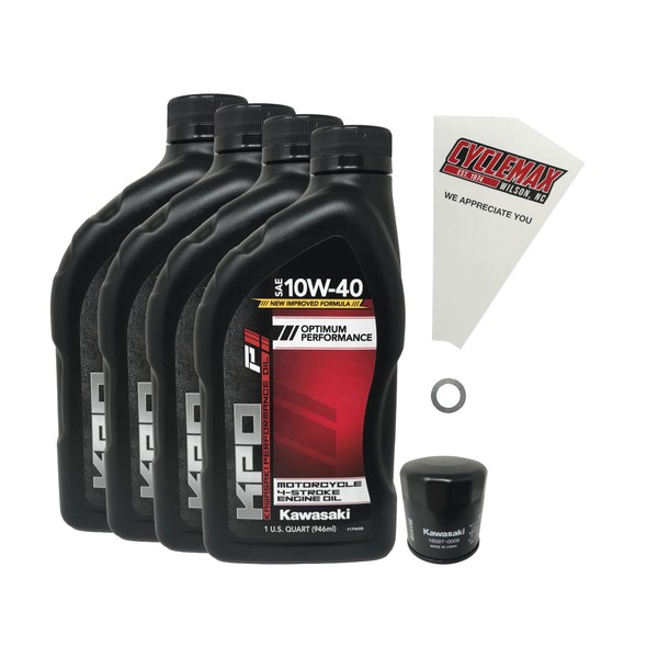 - CYCLEMAX OIL CHANGE KIT INCLUDES: Four Kawasaki K61021-101-01Q KPO 10W-40 Quarts of Oil, One Kawasaki 16097-0008 Oil Filter, One 12mm Drain Plug Crush Washer and a Convenient Disposable Funnel.