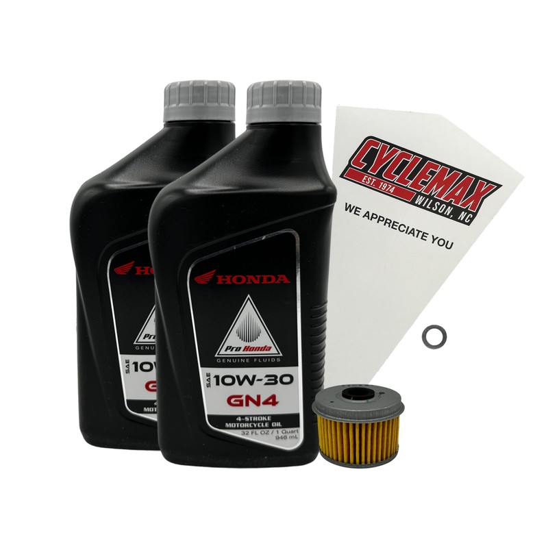 - CYCLEMAX KIT INCLUDES: Two Honda 08C35-SYN HP4s Full Synthetic 10W30 Quart of Oil, One Honda 15410-KYJ-902 Oil Filter, One 12mm Drain Plug Crush Washer and a Convenient Disposable Funnel.