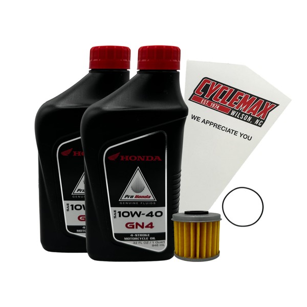 - CYCLEMAX KIT INCLUDES: Two Honda 08C35-A131M02 GN4 10W30 Quart of Oil, One Honda 15412-MEN-671 Oil Filter, One Honda 91356-KWV-000 30mm O-Ring, and a Convenient Disposable Funnel.