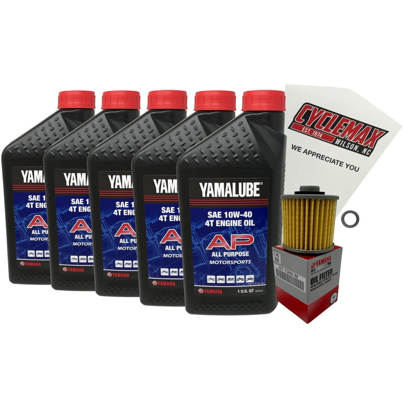 - CYCLEMAX OIL CHANGE KIT INCLUDES: Five Yamaha LUB-10w40-AP-12 Yamalube 10W40 Quarts of Oil, One Yamaha 4X7-13440-90-00 Oil Filter, One 14mm Drain Plug Crush Washer and a Convenient Disposable Funnel.