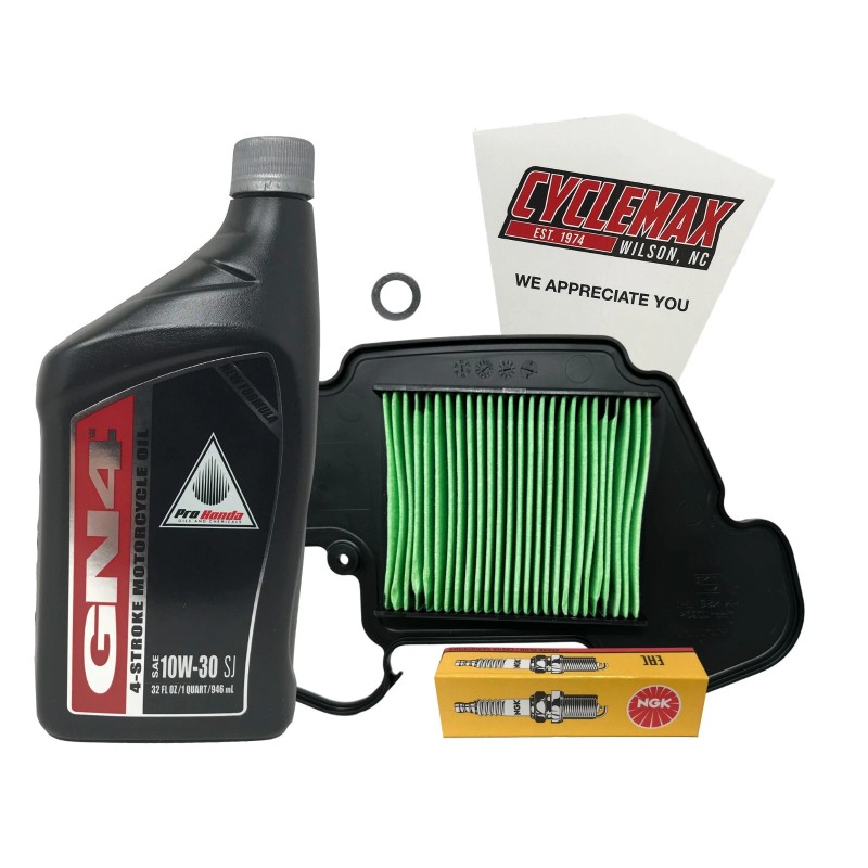 Cyclemax Standard Tune-Up Kit fits 2014-2020 Honda GROM 125 Includes One Honda GN4 10W30 Quart of Oil, One Honda Air Filter, One NGK Spark Plug, One 12mm Drain Plug Crush Washer and a Convenient Disposable Funnel.