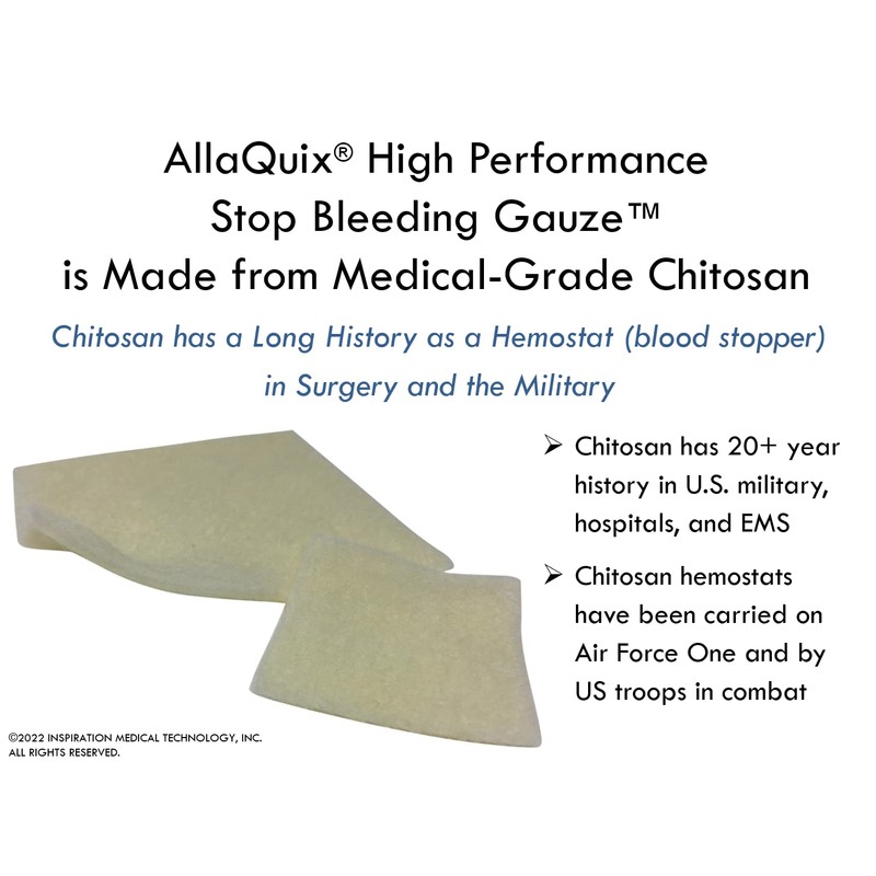 - BE PREPARED! + STOP BLEEDING QUICK LIKE THE PROS! This exclusive kit contains AllaQuix High Performance Stop Bleeding Gauze: the professional-grade hemostat cleared by the FDA. AllaQuix is a high-tech gauze pad made of chitosan, which has been used and proven by medical professionals and the US Military to stop bleeding fast - AllaQuix is specifically designed to stop bleeding, even for people who normally have trouble stopping bleeding
