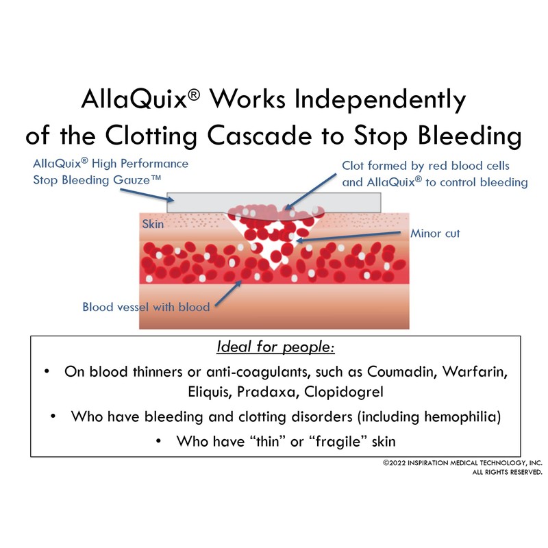 - IDEAL FOR PEOPLE WHO HAVE TROUBLE STOPPING BLEEDING! AllaQuix is designed to work whether the body is able to clot blood on its own or not. That makes it ideal for people on blood thinners or anti-coagulants, for those who have thin skin or are “bleeders”, and for those who have bleeding or clotting disorders, like hemophilia or von Willebrand’s disease. DON’T LET BLEEDING SLOW YOU DOWN! Try AllaQuix Stop Bleeding Gauze!