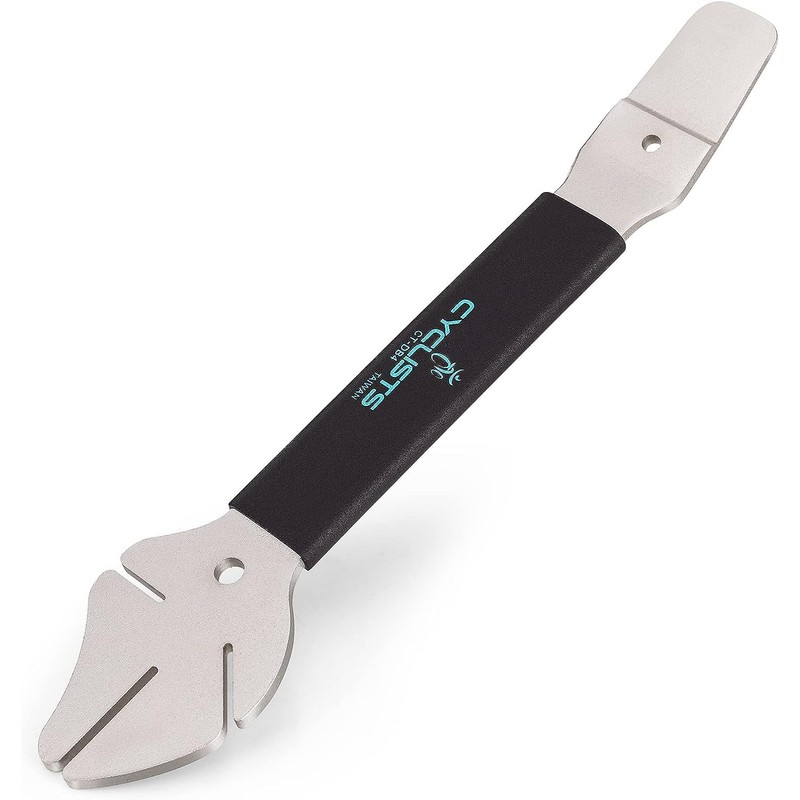 - HIGH QUALITY MATERIAL For more than 10 years experience in bicycle accessories, we know a lot about bicycle products, this rotor fork made in Taiwan - Worldwide excellent bicycle products. This 2-in-1 disc brake tool is made of hardened quality steel and equipped with ergonomic non-slip rubber cure handle, durable and comfortable.