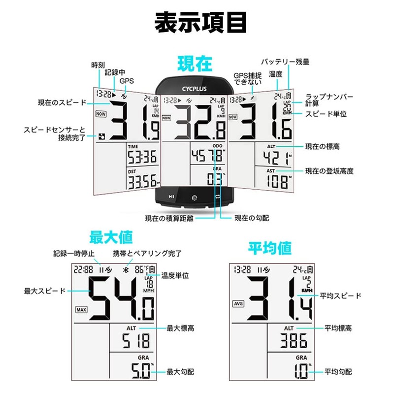 • Display items (13 types): speed, time, distance, acquisition altitude, acquisition altitude, slope, heart rate, cadence, power, accumulated distance, temperature (there are differences in winter), time, lap number
