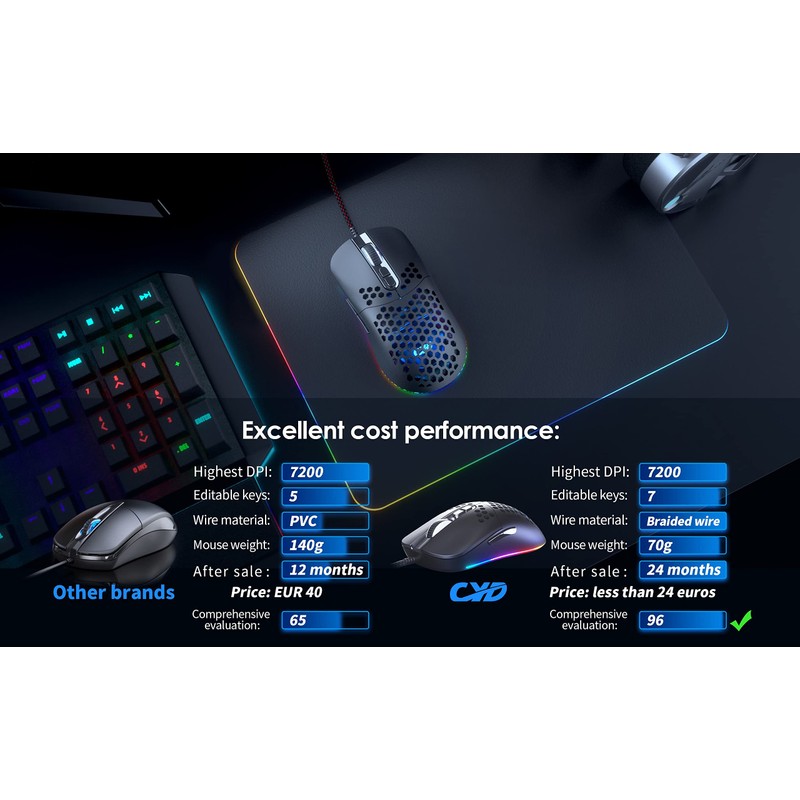 - The wired CYD gaming mouse is the perfect addition to any desktop computer or laptop. The ergonomic design of the gamer mouse and color changing lights make using mouse gamer much more fun. CYD Gaming Desktop Mouse Wired is pretty cheap and feels and looks like a high quality product in your hand.