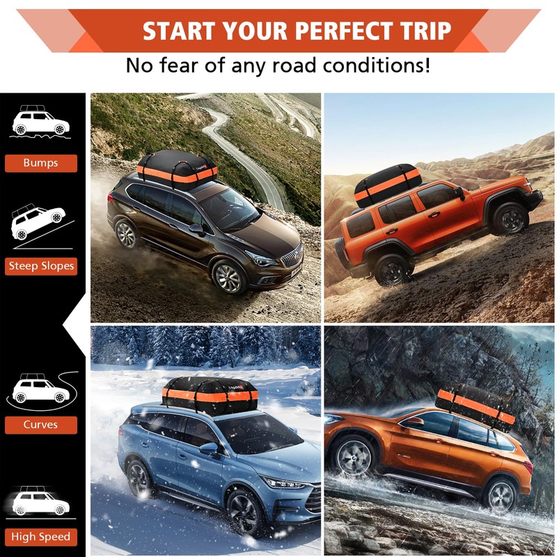 • Large Storage Capacity: 15 cubic feet car rooftop cargo carrier bag can provide additional storage to your car and make your trip more comfortable. The large capacity of the car roof cargo bag can easily accommodate luggage for 4-5 people, such as blankets, tents, sleeping bags, pillows, clothes, and more, providing you with a tidy and organized space.