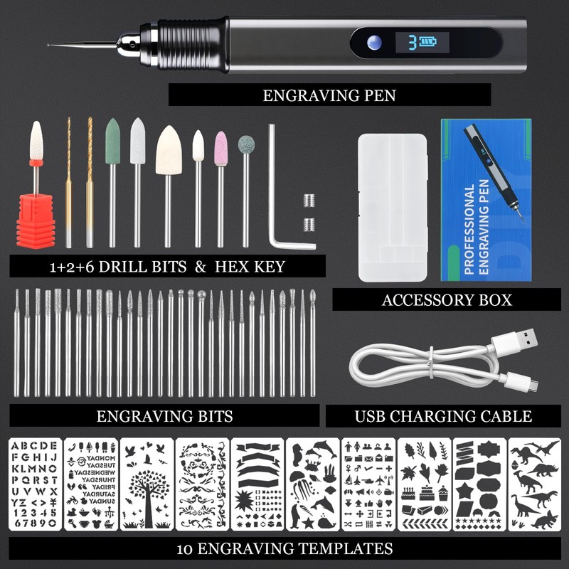 - Electric Engraving Pen Kit With 49 Accessories: Includes 30 high carbon diamond bits and 3 Professional Quality Bits 6 Silicone polishing head and 10 stencils.These bits are sufficient for engraving, carving, sanding, polishing, etching, routing, grinding, drilling, and cutting. You can carve intricate details with ease, and the lightweight and compact design allows you to complete complex jobs effortlessly