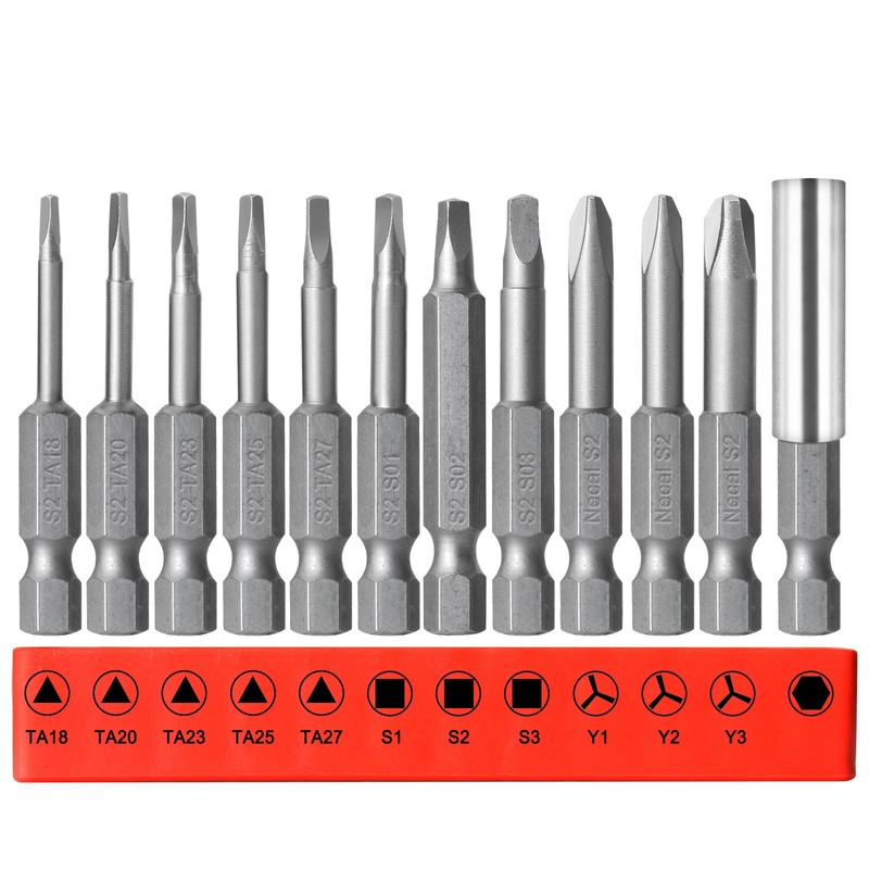 12-piece screwdriver bit set, 5 triangle screwdriver bits, 3 square screwdriver bits, 3 tri-wing bit with hexagonal extension rod, 50 mm magnetic S2 screwdriver set.
