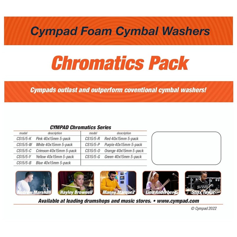 The Cympad Chromatics are coloured cymbal felts made of high-quality foam that not only enhance the visual appearance of a drum kit, but also improve the sound quality and durability of the cymbals.