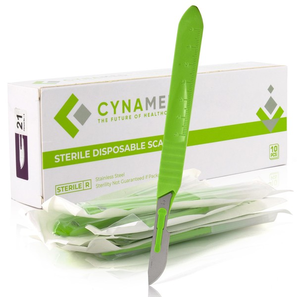 Cynamed Disposable Scalpel Blades| Sharp, Tempered Stainless-Steel Blades | Pack of 10 Sterile Scalpel Knives| Plastic Handle| Individual Pouches| for Dermaplaining, Podiatry, Crafts & More (No.21)