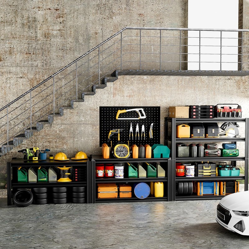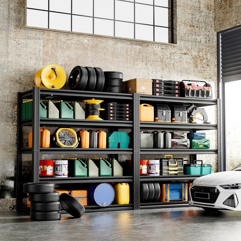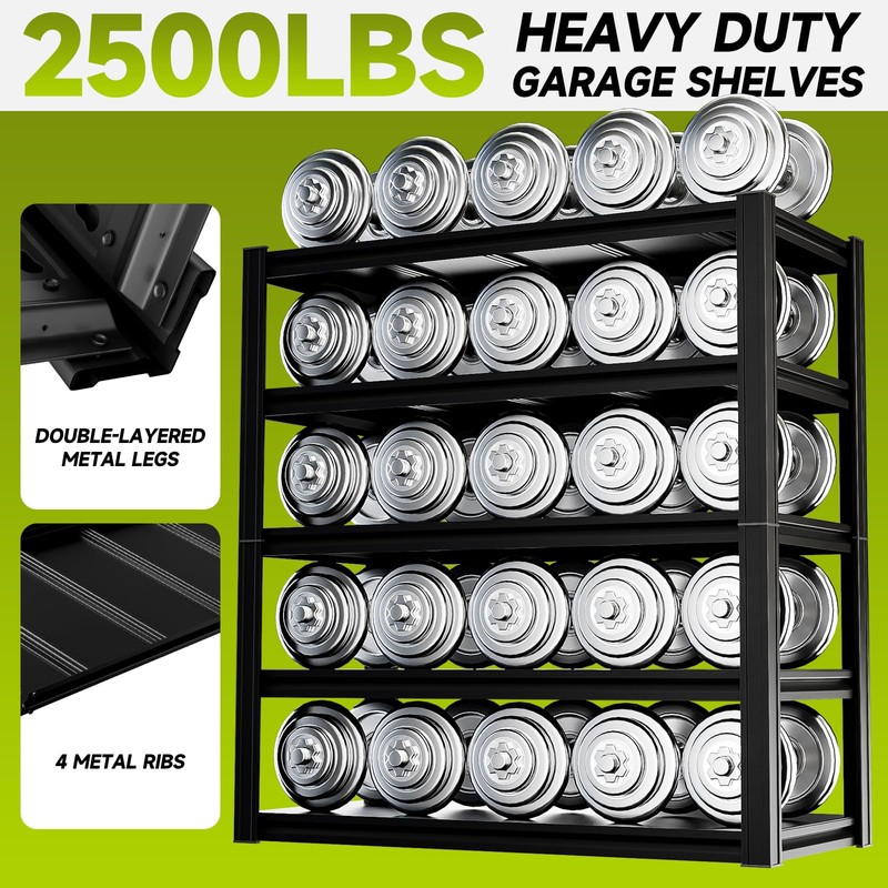 - 2500LBS Heavy-Duty Storage Shelves: Built to handle heavy loads, each shelf compartment includes 4 reinforcing rods on the back, providing an even load capacity of 500 lbs per tier. With a total maximum weight capacity of 2,500 lbs, this unit safely stores heavy tools and equipment. The thick, high-strength metal legs ensure added stability and enhanced durability.