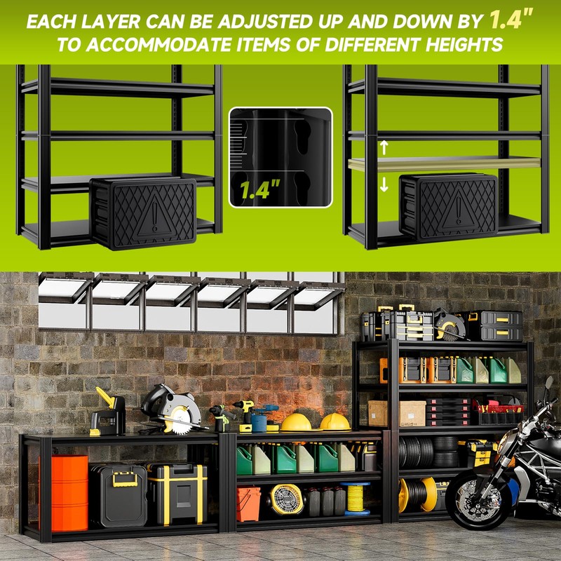 - 48"W x 18.3"D x 72"H Adjustable Garage Shelving: Designed for ultimate flexibility, this industrial shelving unit allows you to easily adjust shelf heights to accommodate items of all sizes, from large toolboxes to small accessories. It can be quickly assembled or disassembled into two horizontal units for extra space or into one vertical unit to maximize height.