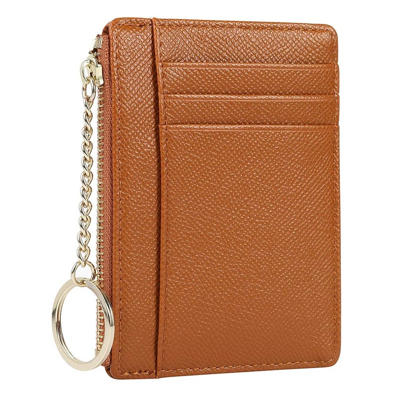 - Although slim, this wallet has a perfectly designed layout to hold cards, cash and coins. Made from textured, cross-grained leather, the zip card case keeps change, cards and other important small items secure