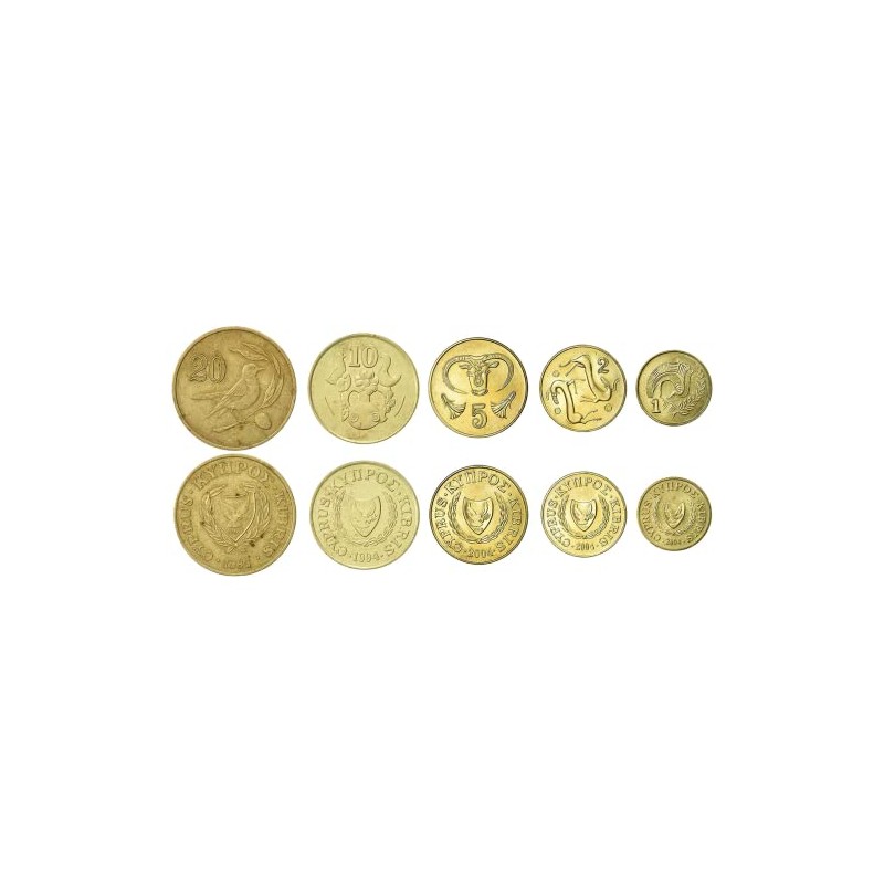 On the Cyprus coins there are coat of arms: a dove holding an olive twig and the independence year 1960. There may be some pictures of: Cyclamen plants, a Pied Wheatear, a head of Greek philosopher Zeno of Citium; a composition based on a 4th century BC coin of the Cypriot Kingdom of Marion depicting the abduction of Europe by Zeus transfigurated into a bull; two heraldically arranged goats taken from a shallow bowl of the mid 13 century B.C; a Head of a bull from a shallow silver bowl (phiale) with a wish-boned handle of the 14th century BC.; a clay vase of Phini village, beautifully decorated with flowers and singing birds.