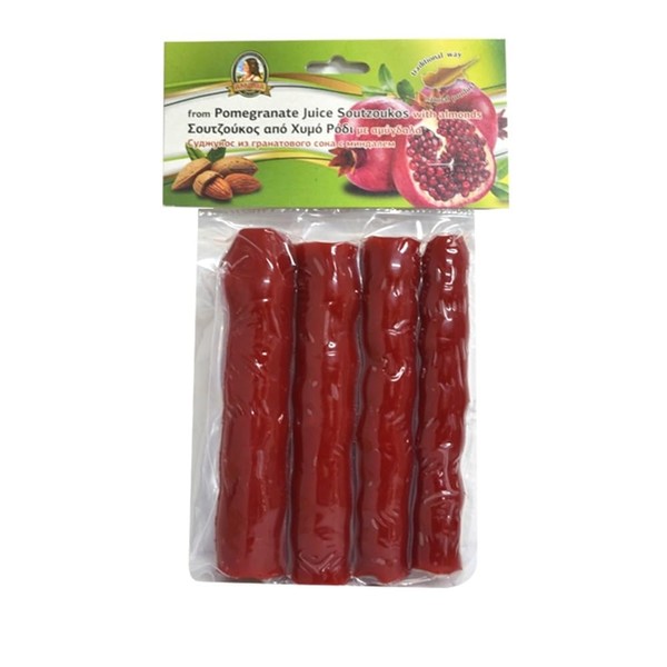 - Cyprus Traditional Amalia Grape / Pomegranate Juice Soutzoukos with Almonds is a delightful and unique treat from Cyprus, known for its rich flavors and cultural significance. Soutzoukos is a traditional Cypriot sweet made from Grape / Pomegranate juice, sugar, and flour, which is shaped into a long, chewy, and slightly sticky bar. The Amalia version of this treat features a delicious twist by incorporating whole almonds throughout the bar, adding a crunchy texture that contrasts beautifully with the smooth, chewy consistency of the Grape / Pomegranate juice-based treat.