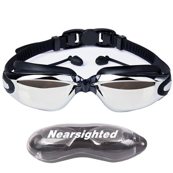Cyrder Nearsighted Swimming Goggles Men Women – Mirrored Shortsighted Swim Glasses, Myopia Goggles with Earplug and Case, HD Anti-fog, UV Protect, -4.0