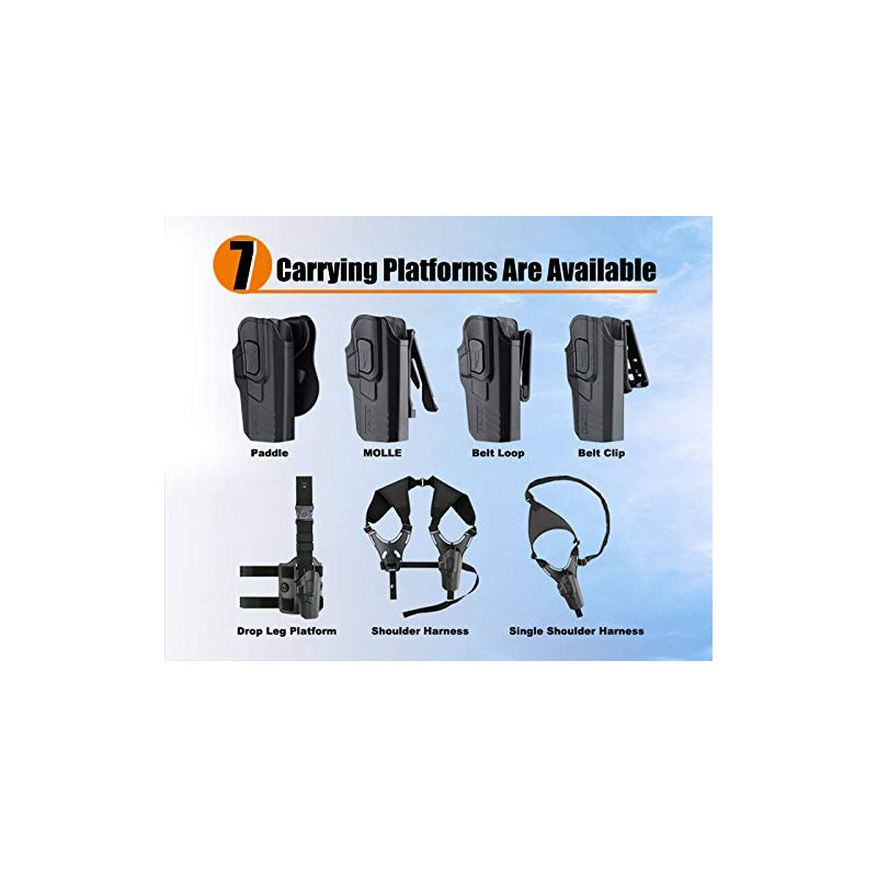 - “8” ATTACHMENT OPTIONS – Holster can be easily removed from standard paddle and attached to Belt Loop (CY-BC-R), Low Ride Belt Loop (CY-P005), Belt Clip (CY-BC2), MOLLE (CY-RMA), Drop Leg Platform (CY-DLP), Single Shoulder Harness (CY-SHS) or Double Shoulder Harness (CY-SHH).