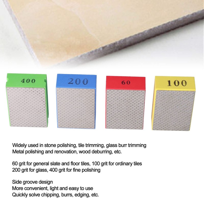 - 4 grain types for all requirements: our tile sanding pads are available in four different grits: 60 grit for rough work, 100 grit for ordinary tiles, 200 grit specially for glass and 400 grit for fine polishing. Each grit helps you work your surfaces precisely and with perfect finish