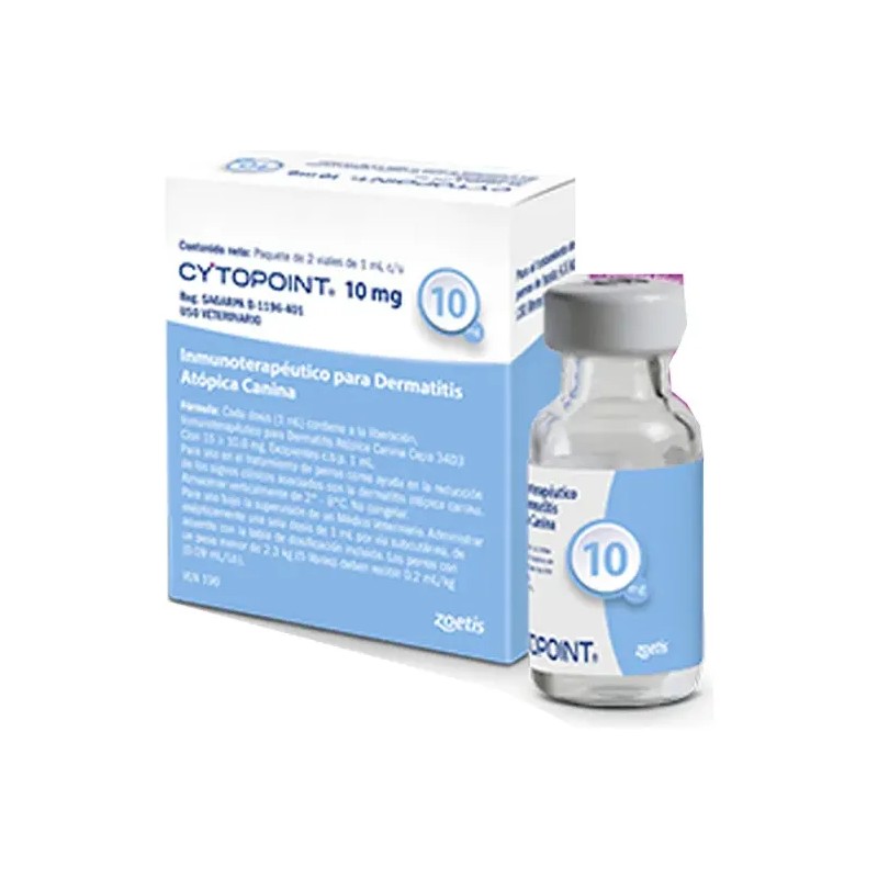 INMUNOTERAPÉUTICO PARA DERMATITIS ATÓPICA CANINA - SOLUCIÓN INYECTABLE. Cytopoint de 10mg es para perros de 2,3 a 4,5kg. Cytopoint® es un líquido estéril, listo para usar, que contiene un anticuerpo monoclonal caninizado (mAb) contra la interleucina-31 (IL-31). Estudios de laboratorio han demostrado que la IL-31 induce prurito en perros. Cytopoint® permanece en la circulación durante varias semanas. Ejerce un efecto terapeútico al enlazar y neutralizar a la IL-31 soluble, inhibiendo así el prurito y reduciendo las lesiones en la piel. Al igual que otros anticuerpos y complejos anticuerpo-antígeno naturales, su eliminación es por las vías normales de degradación de las proteínas.