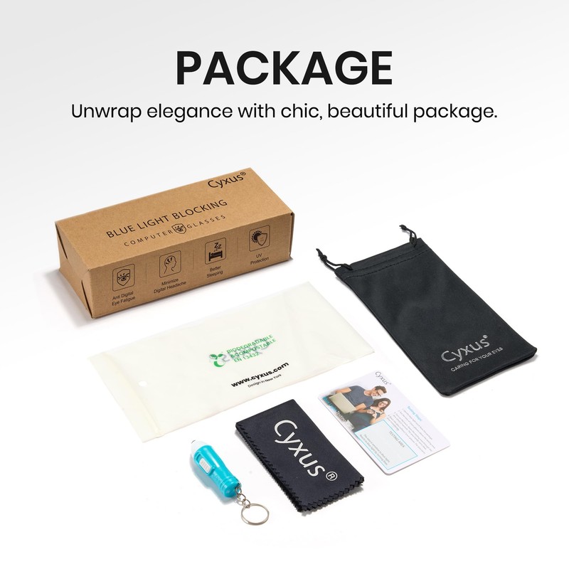 - HEV-Absorbing Technology: Cyxus blue light glasses use advanced HEV-absorbing and anti-radiation coatings to filter harmful blue light (380–450nm) while allowing beneficial light through. Reduces glare and relieves eye strain.
