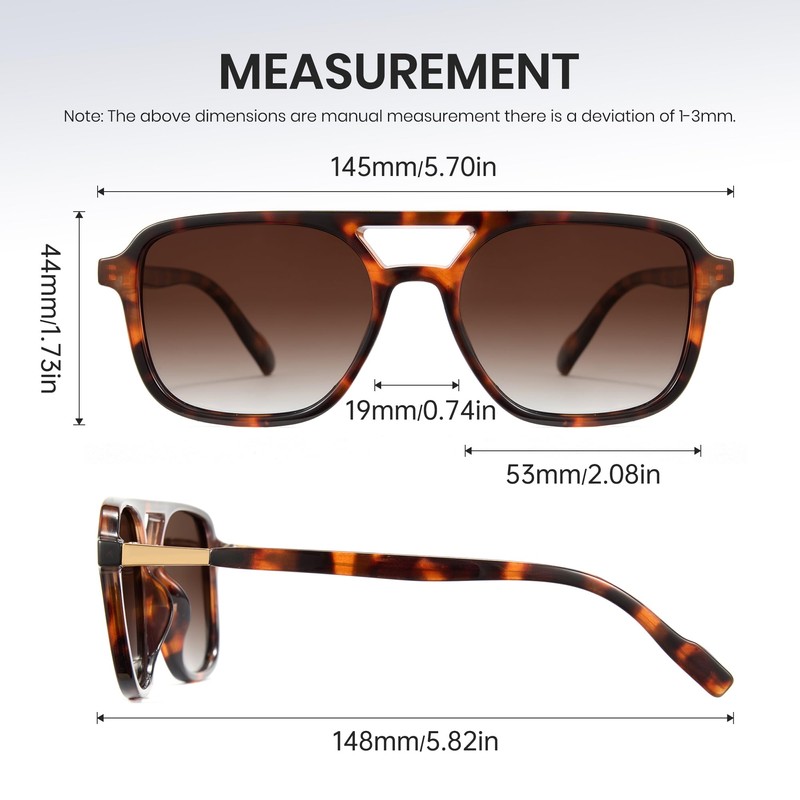 - Sizing Details for Comfort and Fit:Crafted for comfort and a perfect fit, our square aviator sunglasses with double-bridge feature dimensions that include a lens width 54mm, height 46mm, nose bridge 21mm, and temple length 151mm. These aviator sunglasses ensure all-day wear without compromising on style