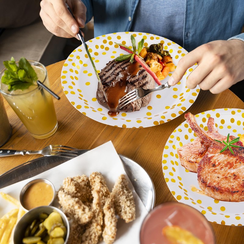 • 【Gold Foil Dot Design】Party Paper Plates has a compact bottom and improve the load-bearing capacity of the paper tray. The charming white base paired with elegant gold foil dot pattern design adds a delicate and modern atmosphere to any party.