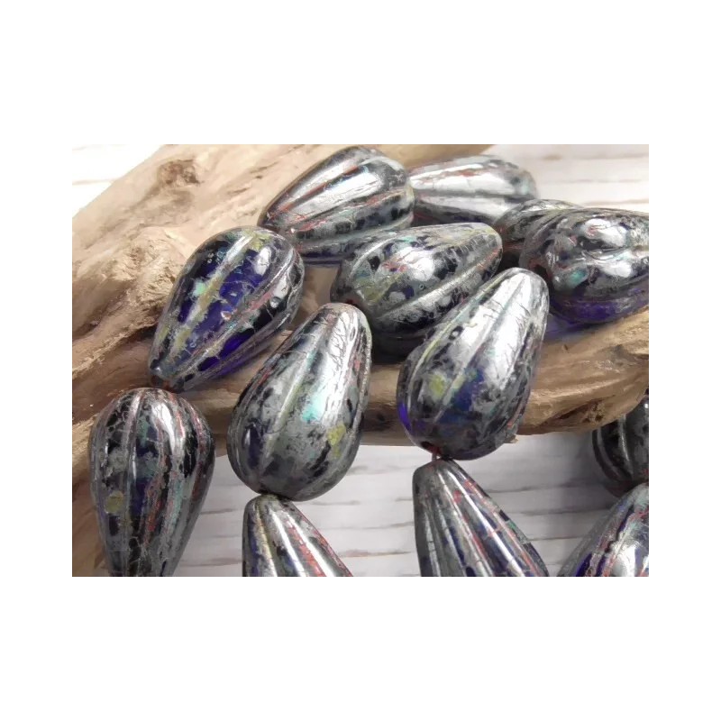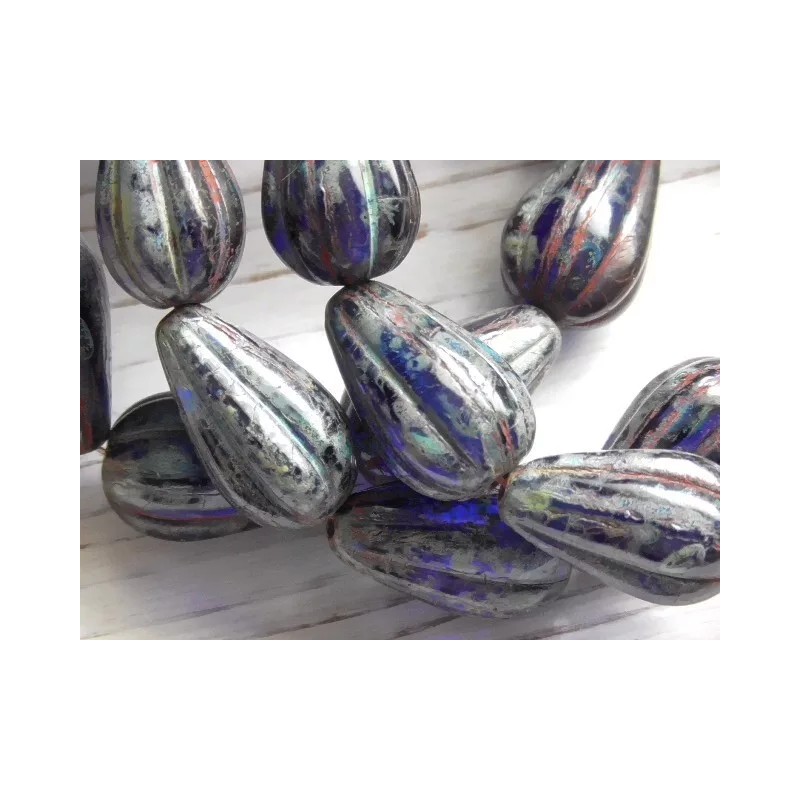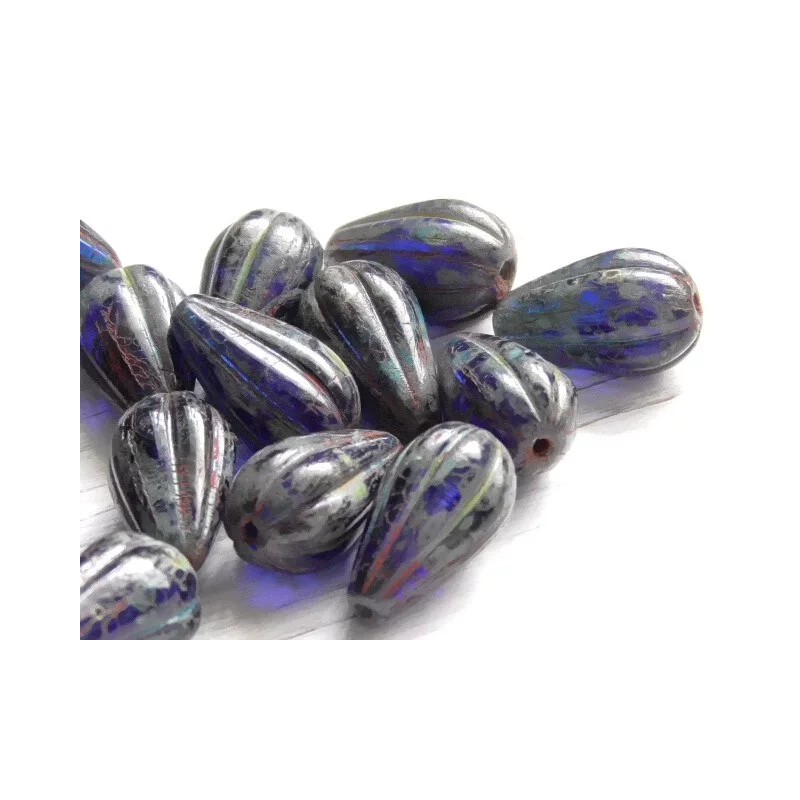 Czech 8 - 13x8mm CZECH COBALT BLUE PICASSO, BRICK RED WASH MELON DROP TEARDROP BEAD
