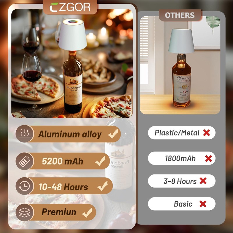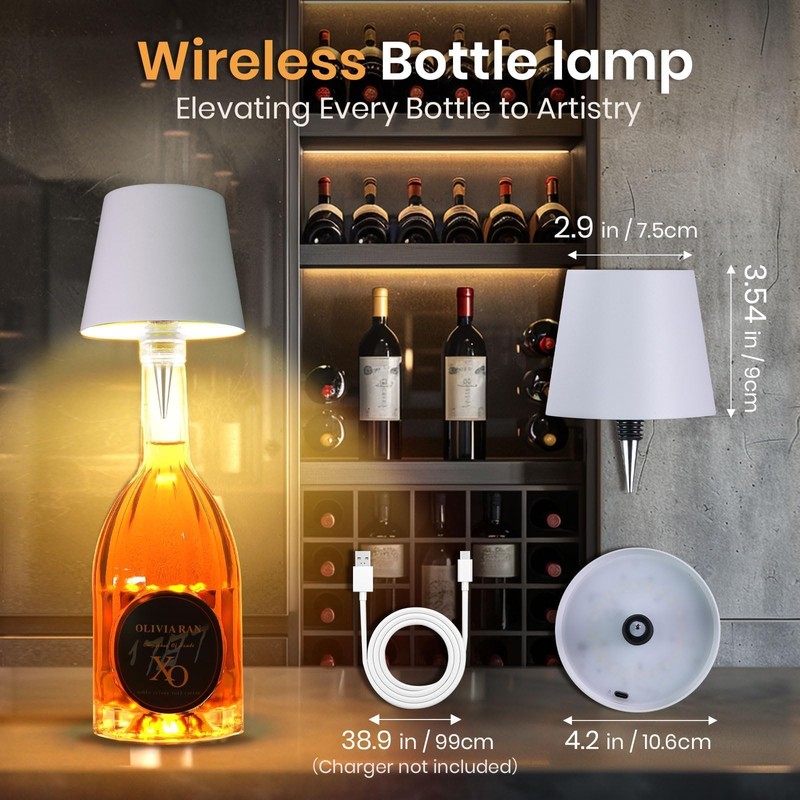 - LED Cordless Bottle Lamp: This touch-controlled bottle lamp offers three adjustable color temperatures and stepless dimming. Whether it’s a cherished wine bottle or a rich whiskey bottle, this rechargeable bottle light transforms them into bright centerpiece decorations, adding a touch of creativity and elegance to any bottle.
