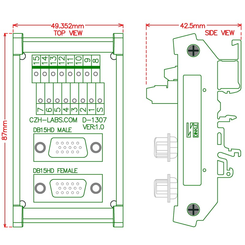 CZH-LABS DIN Rail Mount DSUB DB15HD Male/Female Header Interface Module, D-SUB Breakout Board.