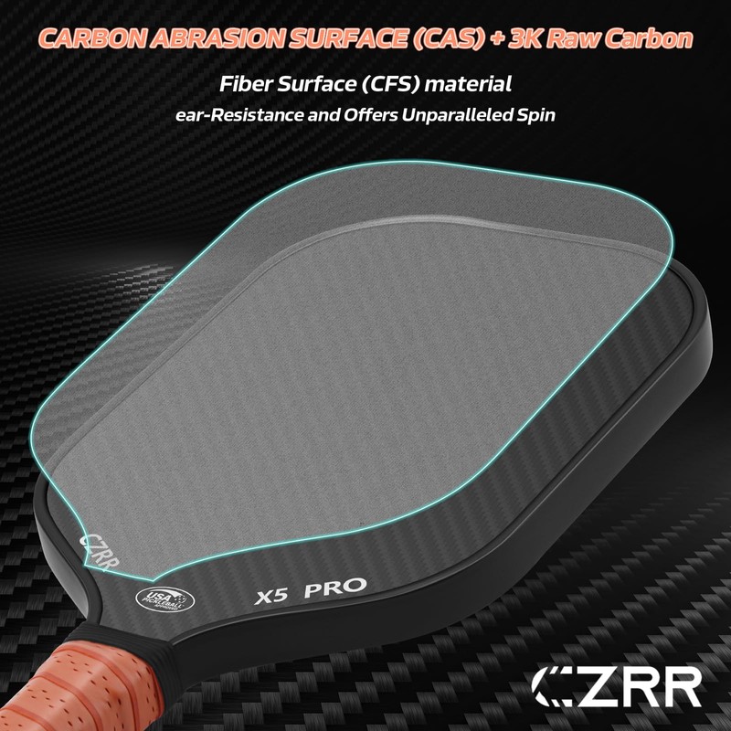 - CARBON ABRASION SURFACE (CAS)】 Advanced Based CARBON ABRASION SURFACE (CAS) + 3K Raw Carbon Fiber Surface (CFS) material, increases its friction, and prolongs the residence time of the pickleball on the racket face, harnessing the raw power with maximum spin & ball control.