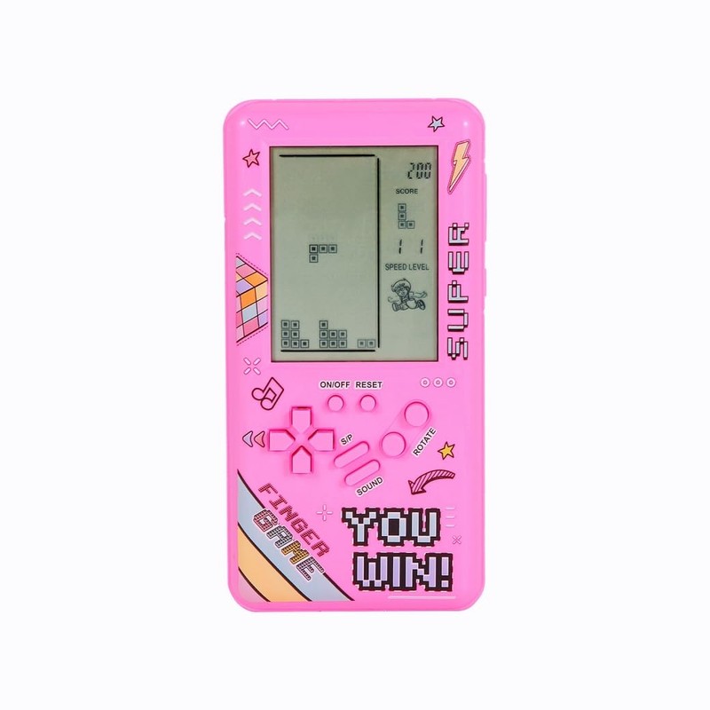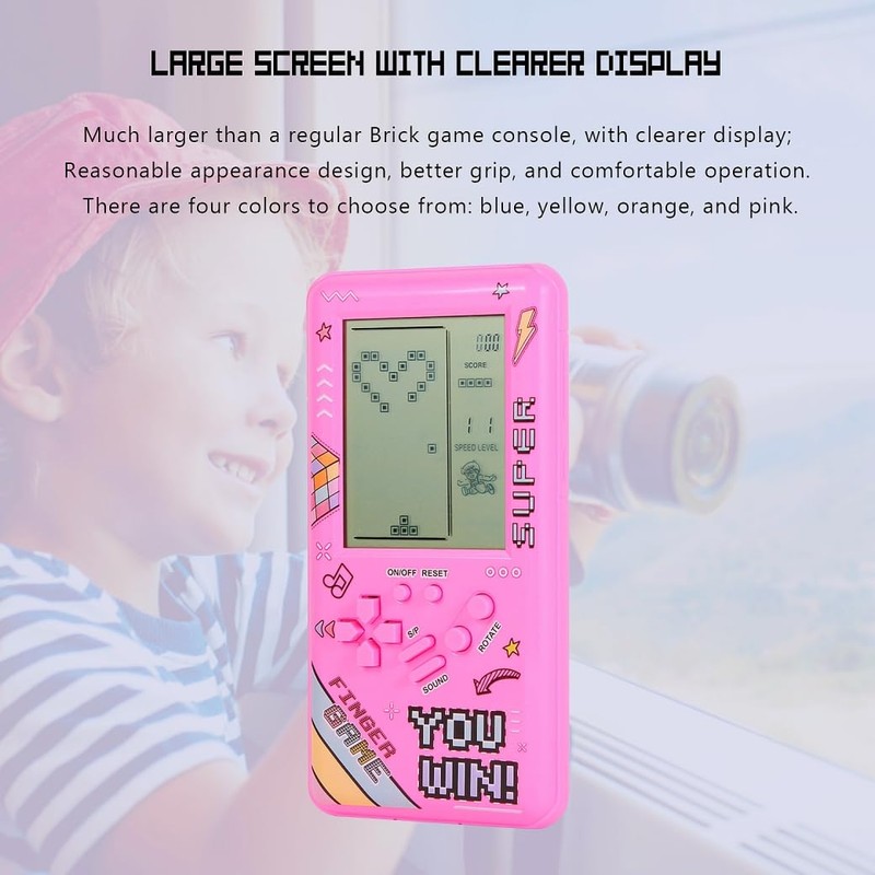 - 4. Large screen, much larger than a normal brick game console, with clearer display; reasonable appearance, better grip and comfortable operation. There are four colours to choose from: blue, yellow, orange and pink.