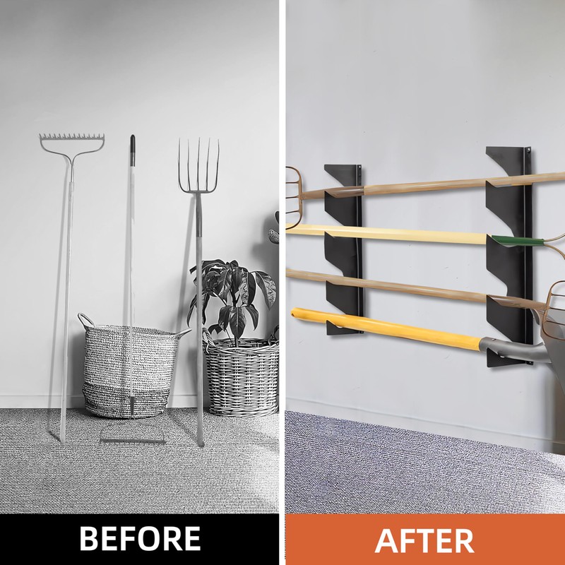 - Wall-Mounted Garage Tool Organizer-Reclaim floor space with 17.5"x4" horizontal wall design—secures shovels, rakes & brooms vertically. Ideal for garages/sheds with exposed studs, keeps long-handled tools accessible yet tangle-free