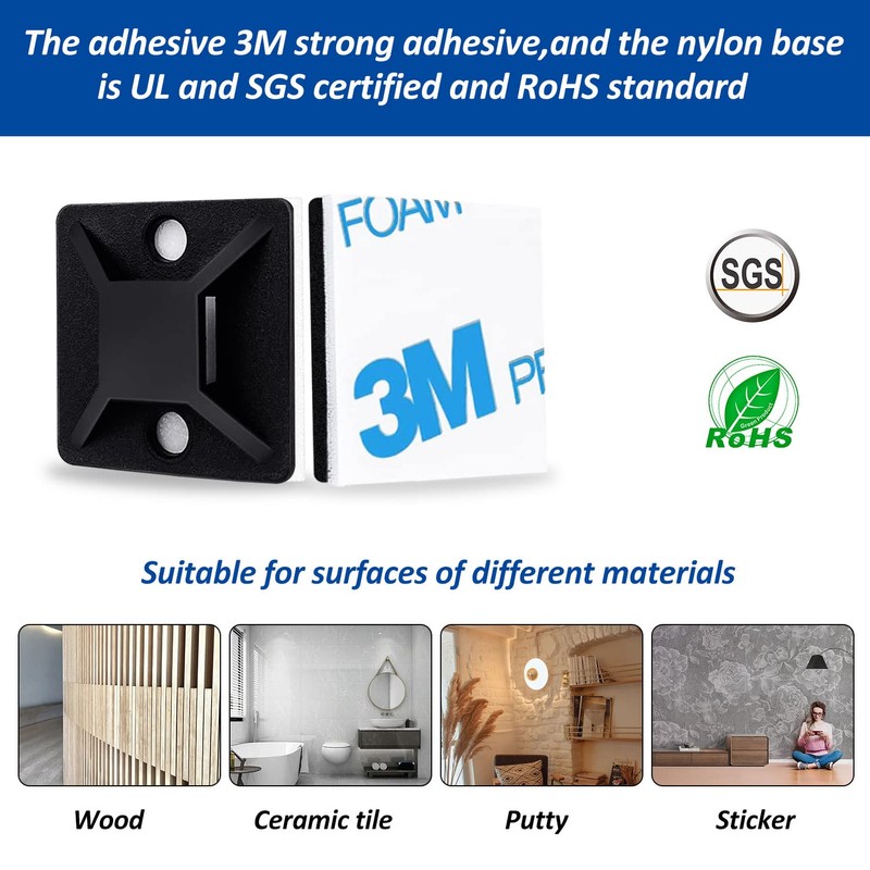 - Strong and Sturdy: Adhesive Zip Tie Mounts are manufactured from 3M Strong Adhesive and PA66 nylon with excellent viscosity and durability.