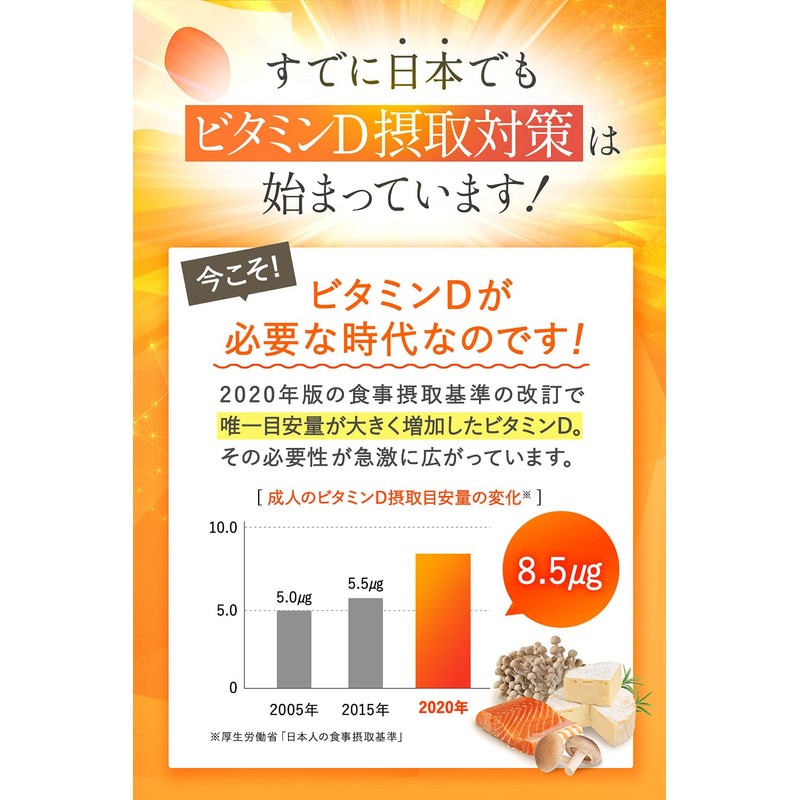 - ✅【今、世界がビタミンDに大注目】「身体を守るサポートビタミン」として認知されてきたビタミンDは世界的に注目されています。アメリカ、カナダ、インド、フィンランドなどの国では、国民の血中ビタミンD濃度を高めるために、食品にビタミンDを添加する政策が行われているのです。またサプリメント先進国として知られるアメリカで、ビタミンDは1番人気。日本でも徐々にビタミンDが注目され始め、2020年版の食事摂取基準の改訂で唯一目安量が大きく増加した栄養素はビタミンD。その必要性は徐々に認知され広がっています。
