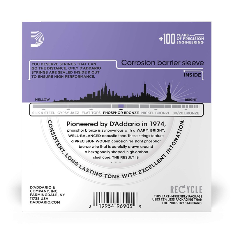 • CORROSION-RESISTANT, PRECISION WOUND – D'Addario Phosphor Bronze acoustic guitar strings are precision wound with phosphor bronze wrap wire, over a hexagonal high-carbon steel core.