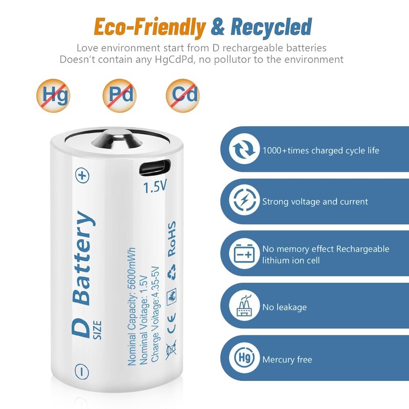 - 【 Rechargeable D Batteries】Rechargeable usb D battery with 1000+ cycles , save your big money comparing with the single use batteries.