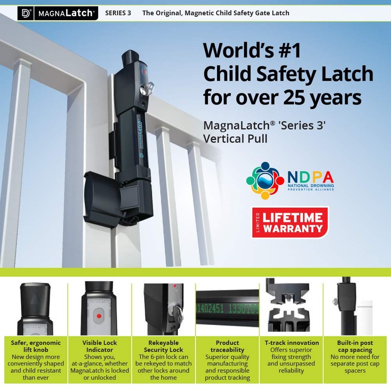 - SAFETY FOR CHILDREN & PETS - For over 30 years MagnaLatch has set the standard for safety gates around the home and garden; this vertical pull latch is out of reach for young kids
