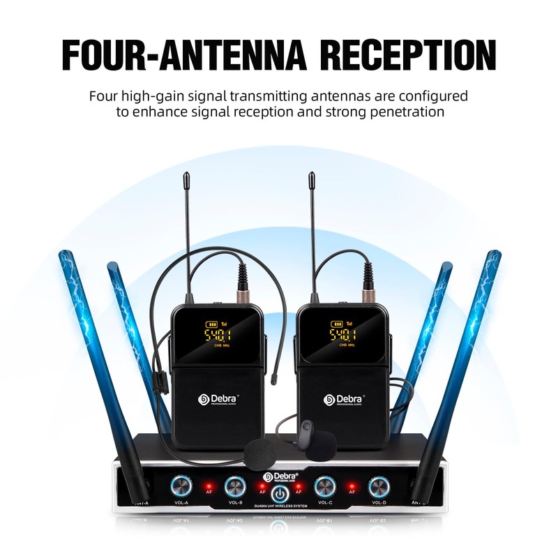 D Debra Audio Pro DU4004 UHF 4 Channel Wireless Microphone System with Lavalier Headset Mics, Ideal for Meeting Church Speech(4 Bodypack)