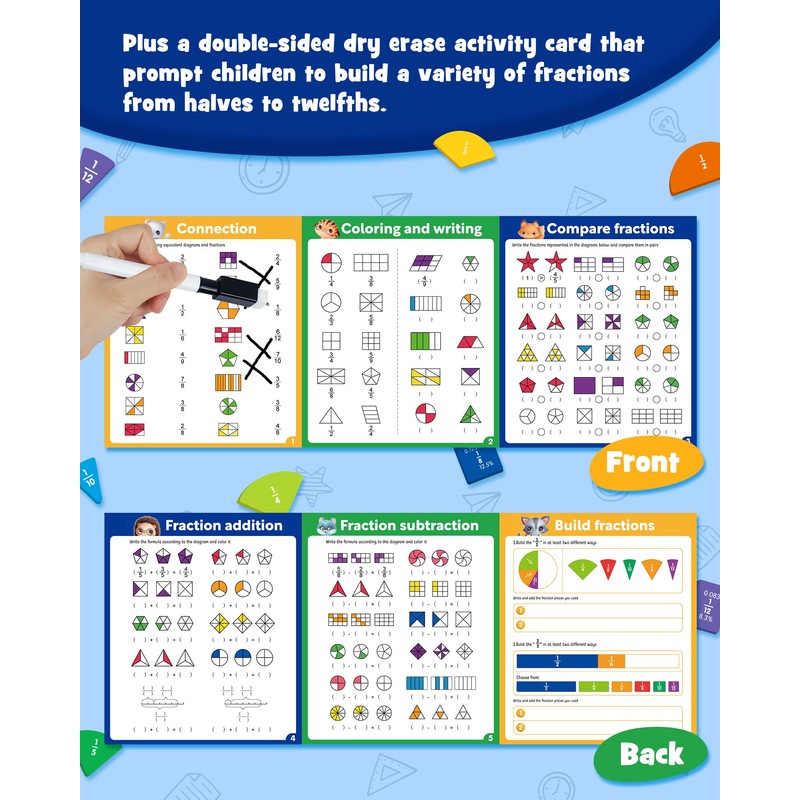 - Package Include: Comes with 1 magnetic fraction book and 102 easy-grip cardboard pieces representing both circle and bar fractions, 1 double side dry erase activity card that prompt children to build a variety of fractions from halves to twelfths, 1 dry erase markers and 1 storage bag