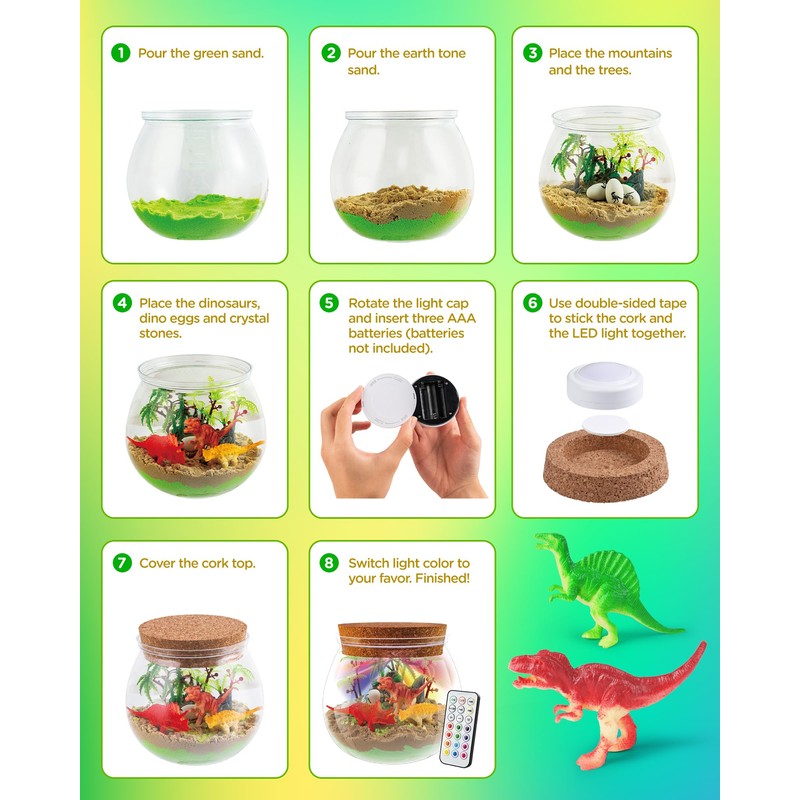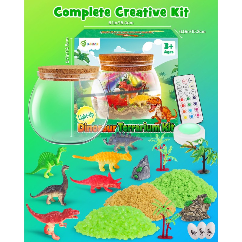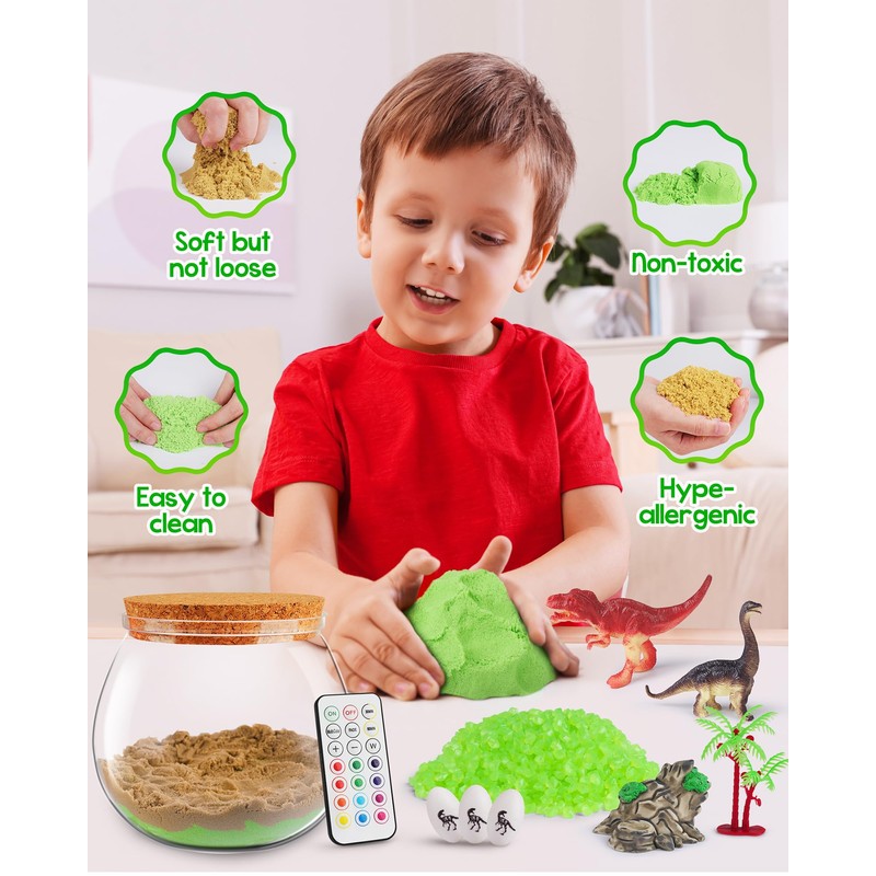• Unique Terrarium Set: This dinosaur art kit for kids comes with magic sand, preserved mosses, a 13-coloured LED night light with remote control, 6 dinosaur miniatures, dino egg miniatures, rockery miniatures, and decorative accessories. The cute arts and crafts project for kids.