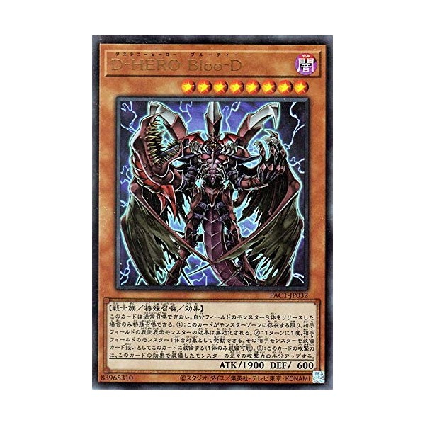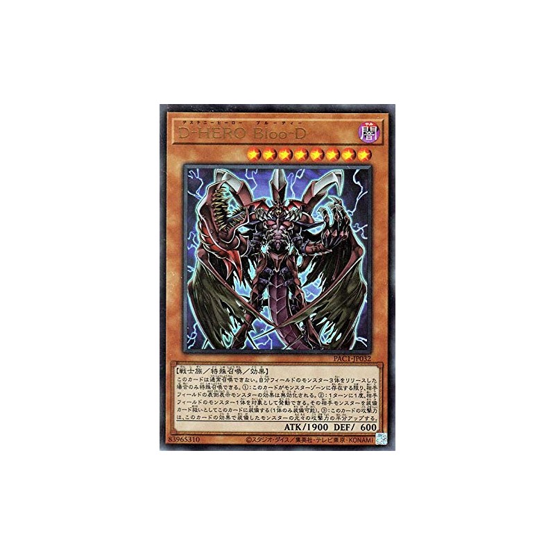 - ★Yu-Gi-Oh PRISMATICARTCOLLECTION (Prismatic Art Collection) (PAC1) Recording ■Card Name: D-HEROBloo-D 【Effect Monster】Ultra Rare ■Star 8/Dark Attribute/Warrior/Attack:1900/Defens:600/■This card cannot be Normal Summoned. You can only Special Summon 3 monsters you control! (1): Unless this card is in the Monster Zone, the face-up monster effect is disabled from your opponent controls. (2): Once per turn, target 1 monster your opponent controls. This card is equipped with that opponent monster as a equip card handling (only 1 card). (3): This card's ATK power is only increased by half the original ATK power of the monster equipped with this effect. ID: 83965310