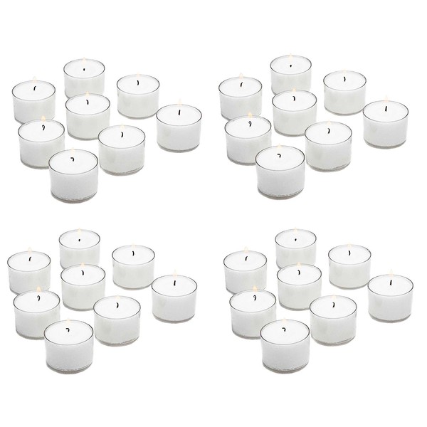 Extended Burn Time 7 Hour Tea Lights White Tea Light Candles Unscented in clear plastic cups Set of 100 Extended long burn time of 7 Hours TeaLight Candles - Unscented Tea Light Candles with 7-8 Hour burn time each - The candles are 1.5-inch x 1.5-inch x 1 inch tall - They fit perfectly in the Glass Tealight Holders. These unscented clear cup tealights will suit all your needs when quality and value is essential for weddings and home décor. - Elegant Jumbo Tealights Great for Spa's Bar's Restaurant's Flower Shops Event Planners and for Weddings - Never Be Busy Again Lighting Candles During Your Party! They Last Very Long - Emergency Survival Candles Great for a power outages Blackouts Stock up for The Winter Storms. You don't have to be busy re-lighting candles during your event . They are extra long burning and pretty. not in aluminum tins they are in clear candle holders extended 7-8 hour burn time - wedding centerpieces. White unscented great for wedding tealight and party favor decoration Candles. Elegant jumbo Tealights. Great for spa's, bars, restaurants, Flower Shops event planners and of course for brides. They last very Long. These tealight will work well in mason jars also in ceramic warmers to diffuse oils. Will fix Tealight candle holders, tea warmers, tart and food warmers.. Made in the USA.