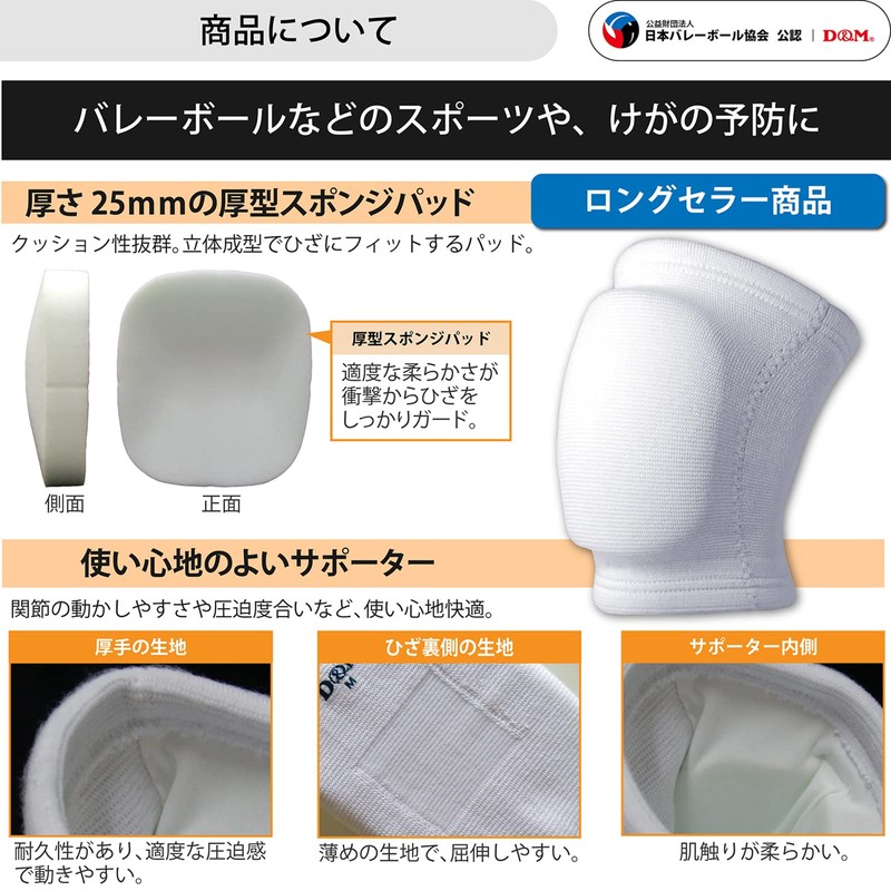 D&M #837 Volleyball Knee Brace, For Knees, 1.0 inches (25 mm), Thick Padding, 3D Fixation, Protection, Breathable, Flexible, Impact Absorption, Elastic, Sweat Absorbent, Quick Drying, Unisex, Adults, Pack of 1, Association Certified, White, Size M