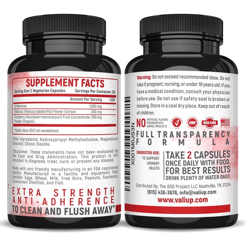 VALI D-Mannose 1000mg Urinary Tract Health Formula. Organic Cranberry Fruit Powder & Hibiscus. Healthy Bladder, Natural Cleanse, Fast Detox Flush, Herbal UT Function Support Pills. 60 Veggie Capsules